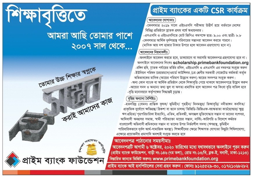 Prime Bank scholarship application will be continued till 6 October, 2020 and its result will be published after 3 months later of application. All of news related Prime bank scholarship will be posted here. You are invited to keep your eye on this site regularly. Thanks.