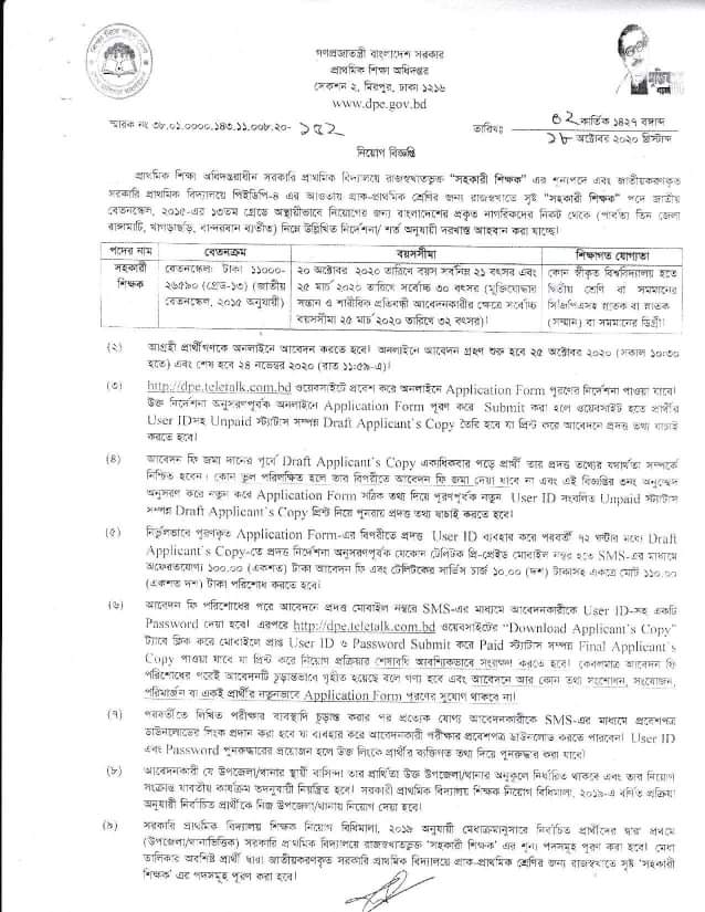 Primary job circular 2020 Application start: 25 October 2020 Application end: 24 November 2020 Application link: Total posts: 32,577 Pre-Primary: 25,630 Primary: 6,947 Study regularly to make a good figure in the examination. You will get all related news in this post. Thanks Answered by Birds of the sky (2 Golds) Tuesday, 20 Oct 2020, 04:57 AM |
