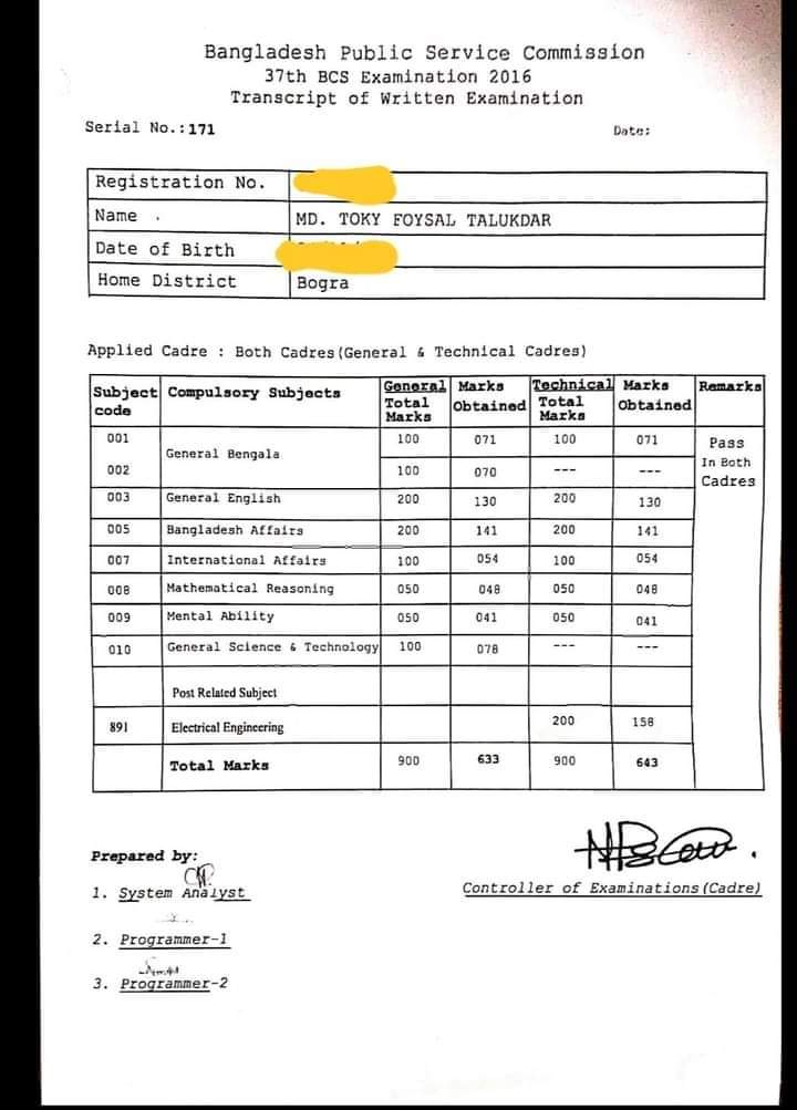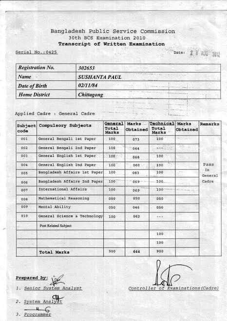 Bangladesh Civil Service (BCS) written exam marksheet view some image.