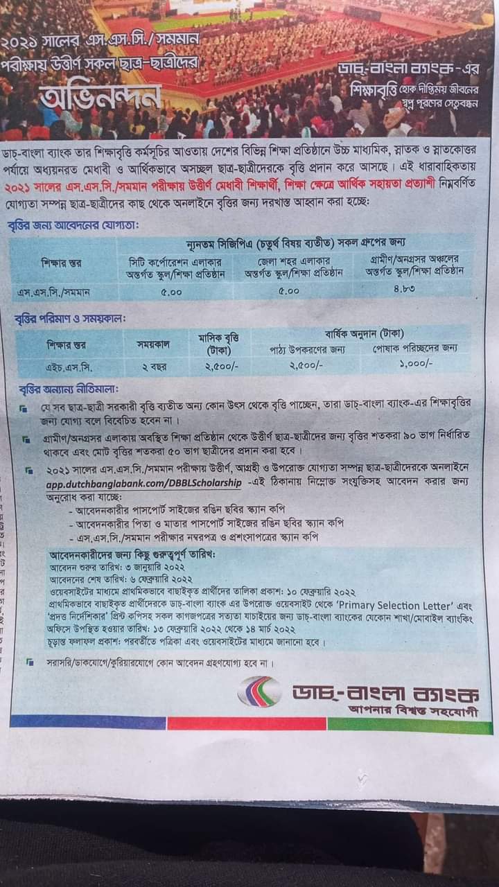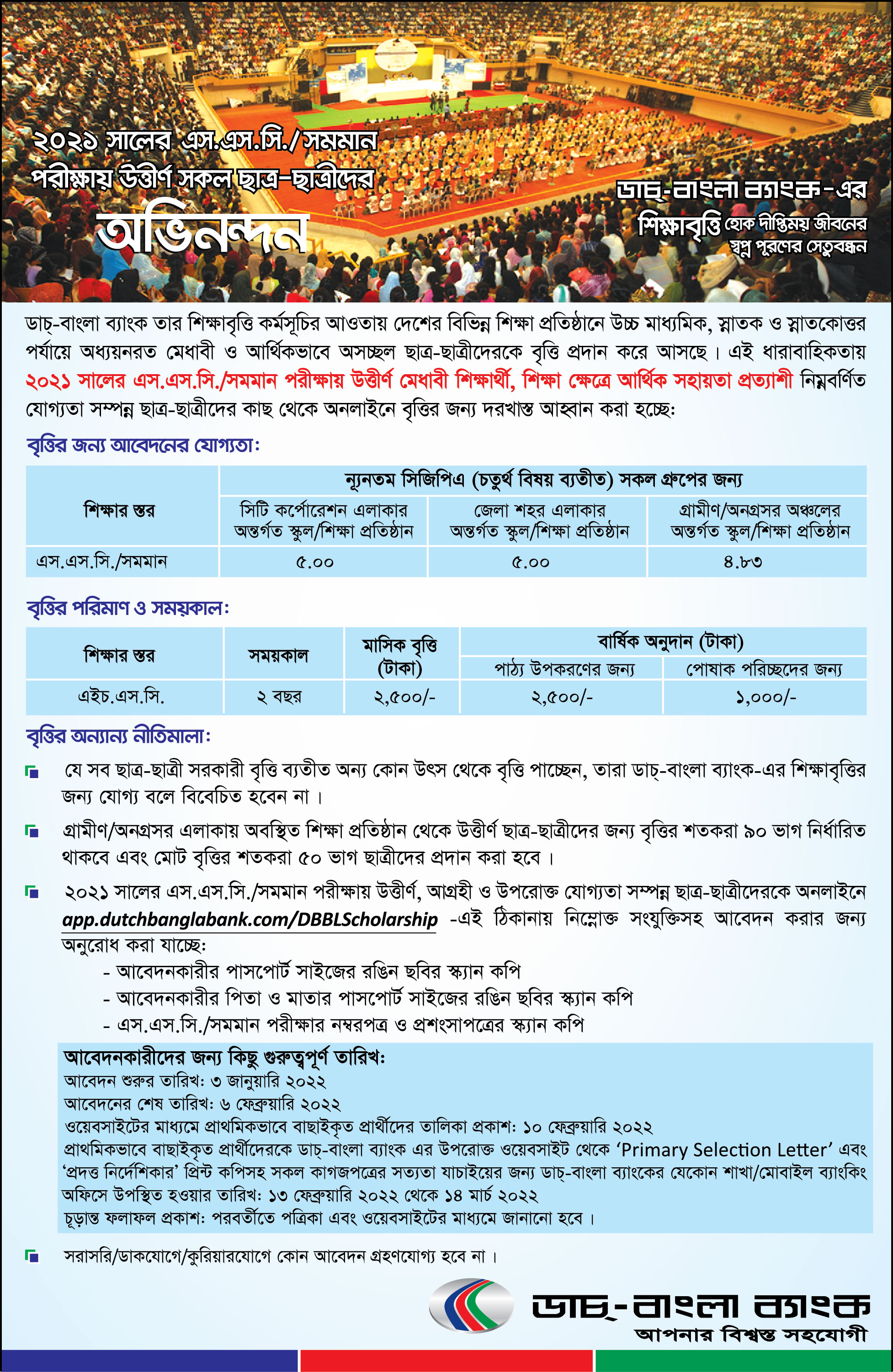 1. Dutch-Bangla Bank, under its social cause program, has been awarding scholarships to the meritorious students in need of financial aid studying at different levels of education since its beginning. Dutch-Bangla Bank awards new scholarships every year along with renewal of existing awardees. 2. The Bank has given scholarships to the deserving students from huge applications following a set of criteria such as the applicant's academic results, financial capability, physical conditions etc. Around 90% of the scholarships have been given to the rural students and 50% to the female students. 3. Dutch-Bangla Bank has been awarding scholarships to meritorious students in need of financial aid studying at higher secondary, graduation & post-graduation levels. In continuation of this program applications are invited for Dutch-Bangla Bank scholarships from meritorious students in need of financial aid who passed S.S.C./equivalent examination in 2021 and meet the following requirements: Other criteria of the Scholarship: