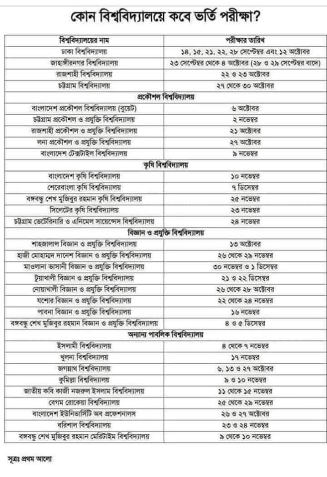 ঢাকা বিশ্ববিদ্যালয়ের ভর্তি পরীক্ষা শুরু হবে ১৩ সেপ্টেম্বর থেকে। ভর্তির আবেদন শুরু ৫ আগষ্ট থেকে। ১। ভর্তি পরীক্ষার আবেদনের সময়কাল: ৫ আগষ্ট থেকে ২৭ আগষ্ট। ২। ভর্তি পরীক্ষার সময়সূচি : ৬০ নম্বরের বহুনির্বাচনি (এমসিকিউ) এবং ৪০ নম্বরের লিখিত পরীক্ষা অনুষ্ঠিত হবে। ৪০ নম্বরের লিখিত পরীক্ষার ধরন কী রূপ হবে সে বিষয় নির্ধারণ করে সাব-কমিটি সামনের সপ্তাহের মধ্যেই এ বিষয়ে আনুষ্ঠানিক সিদ্ধান্ত জানাবে। সোর্স: নয়া দিগন্ত। |