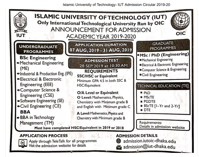 IUT Admission Test application will be start on 7 August, 2019 and continue upto 31 August, 2019 and exam date is 28 September, 2019.