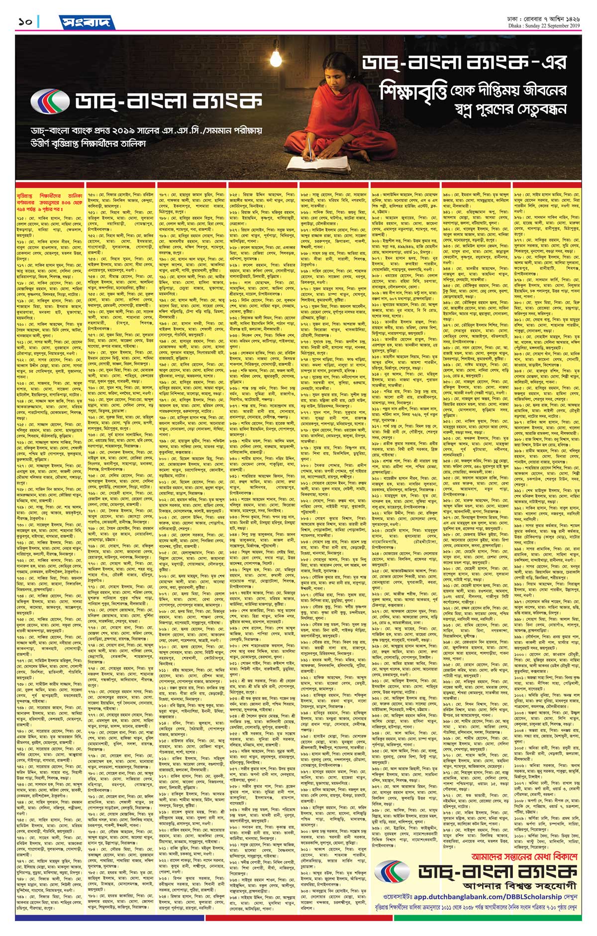 DBBL SSC 2019 Scholarship result images. The Daily Sangbad Newspaper on 22 September, 2019. Total 2038 students are selected. Scholarship result official online link: https://app.dutchbanglabank.com/DBBLScholarship/showResultsGlobalParemetersAction.action?batch_Id=SSC-2019 And the images of DBBL SSC Scholarship results are given below. First 4 images are for boys and second 4 images are for girls. thanks. Answered by AL MaMun (4 Golds) Sunday, 22 Sep 2019, 12:37 PM