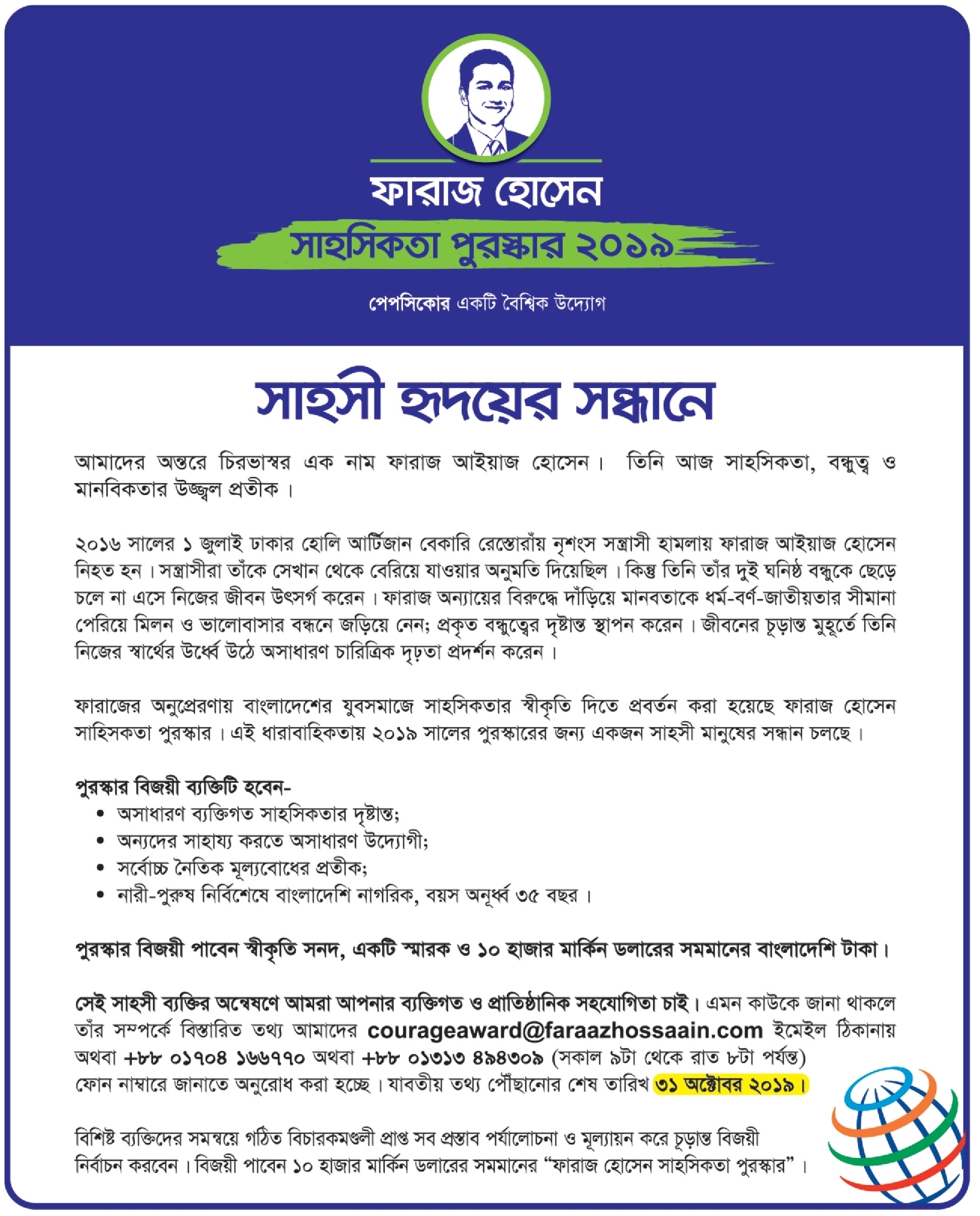 Faraaz Hossaain Courage Award 2019 by PepsiCo Global. The winner will get a certificate and 10 thousands USD Dollar. To apply send an Email at courageaward@faraazhossaain.com or please contact at 01704166770 and 01313494309 (From 9am to 8pm only). Last date for application: 31 October, 2019.